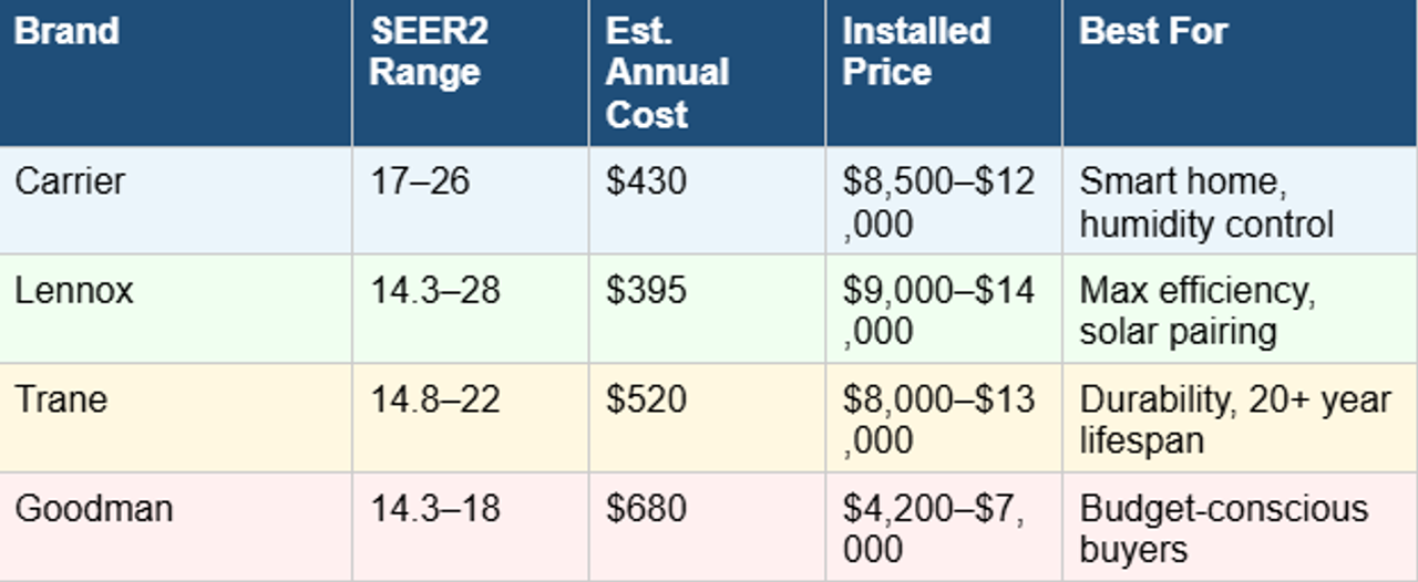 Understanding SEER (Seasonal Energy Efficiency Ratio) ratings reveals significant cost differences among best AC brands 2026. You can verify certified SEER2 ratings for any model through the AHRI Certified Products Directory. The table below serves as an at-a-glance infographic for Simi Valley homeowners: