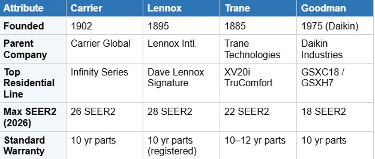 The table below serves as a structured knowledge graph comparing the four major HVAC manufacturers at a glance.