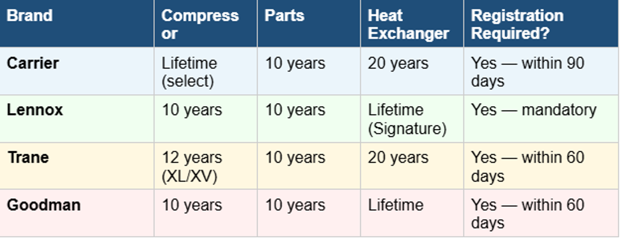 - Brand longevity: Carrier (120+ years), Trane (140+ years), Lennox (130+ years)